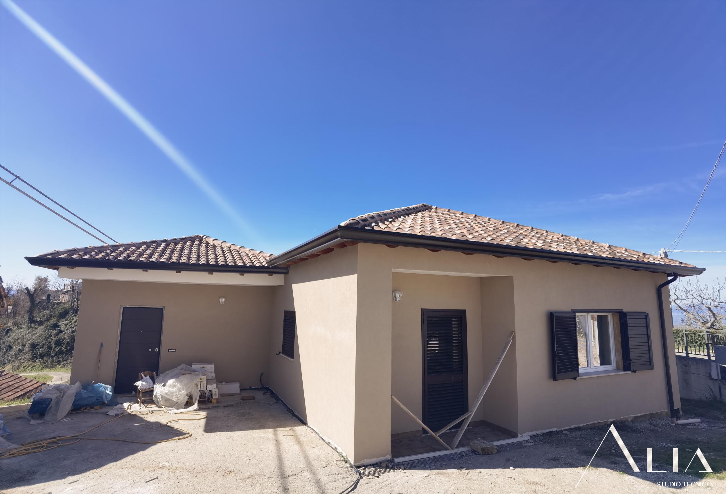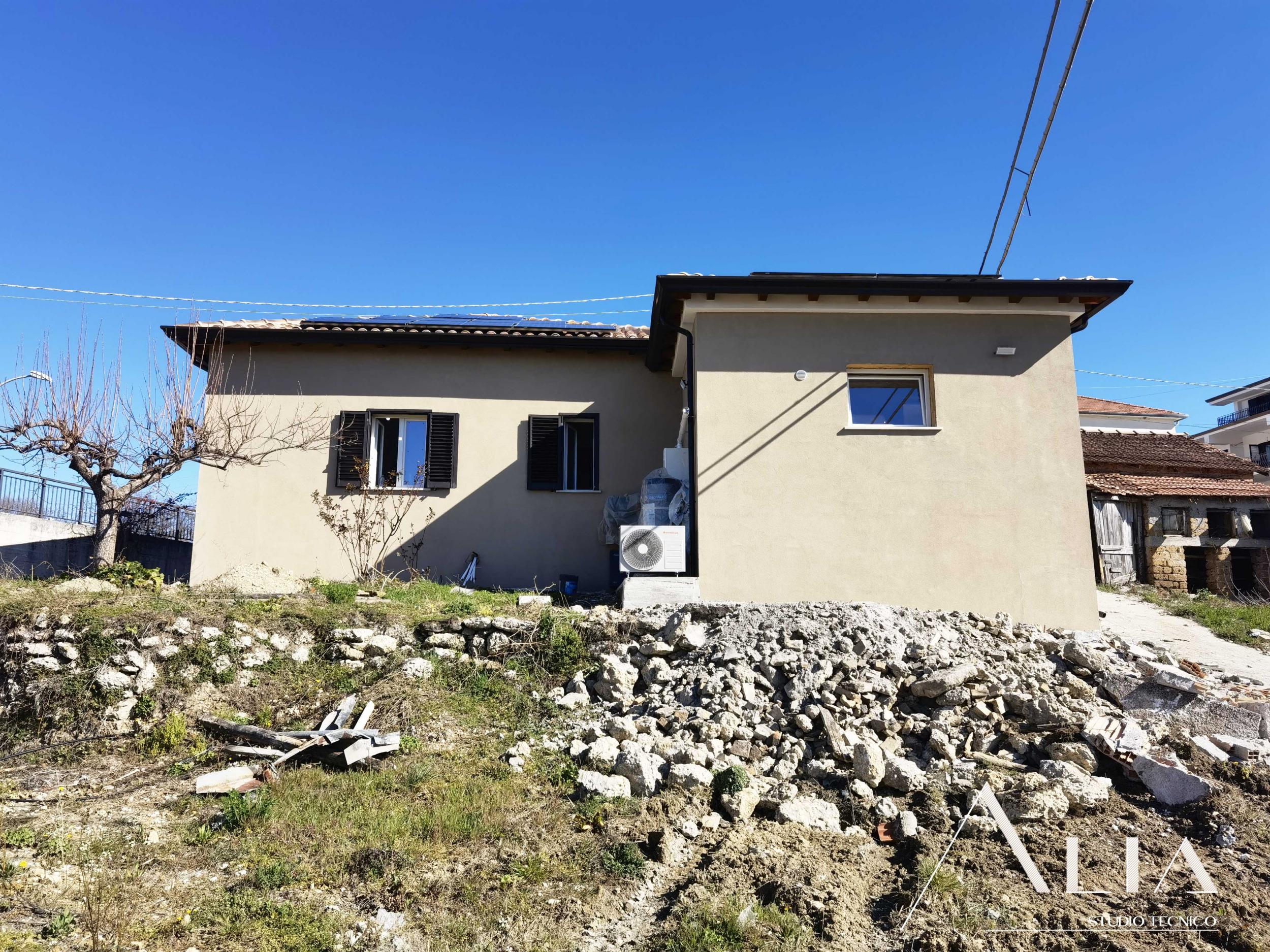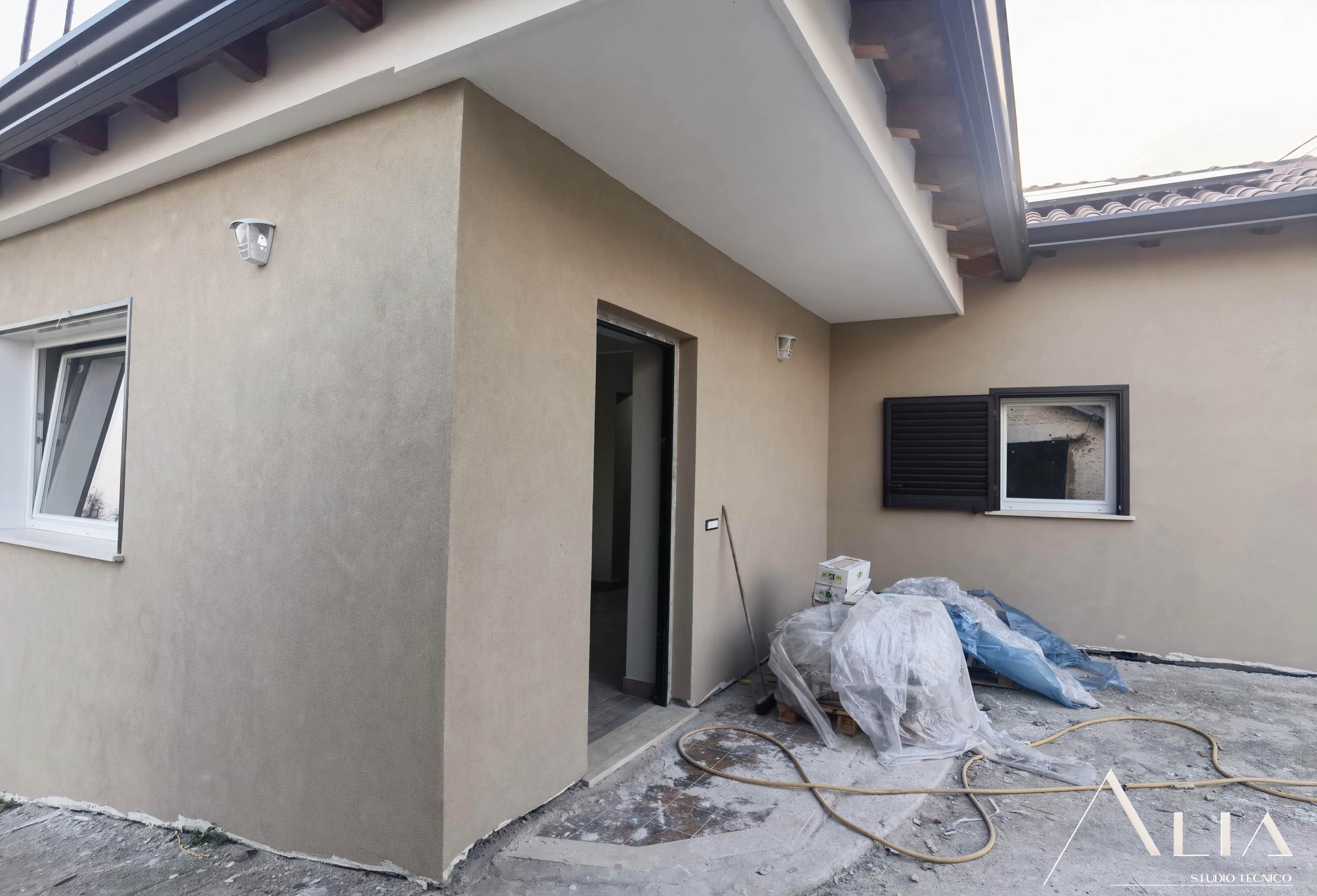 - l'isolamento termico totale dell'edificio tramite l'istallazione di un cappotto termico sulle pareti perimetrali, la coibentazione del nuovo tetto in legno e del nuovo pavimento controterra, quest'ultimo anche isolato tremite insermento di igloo;