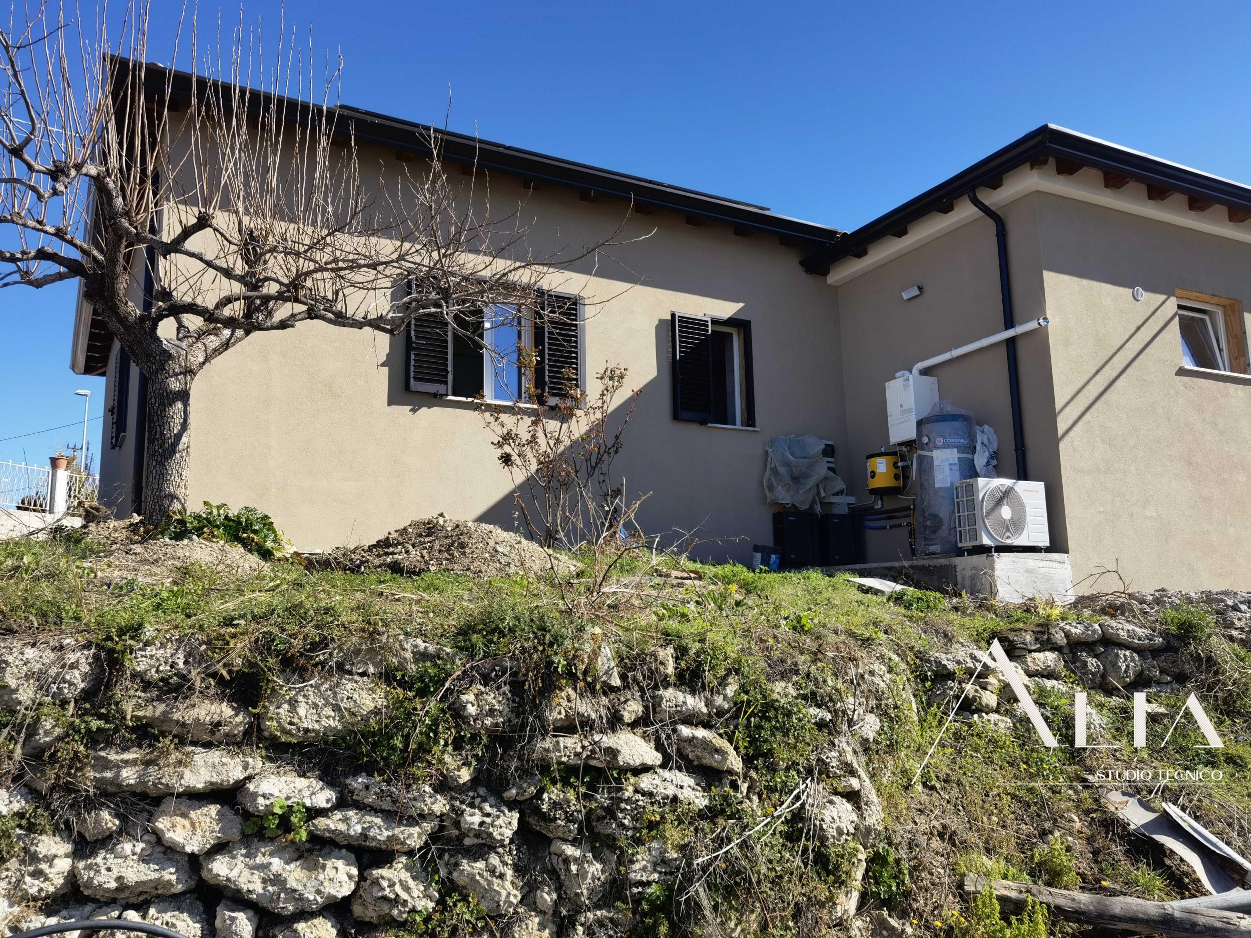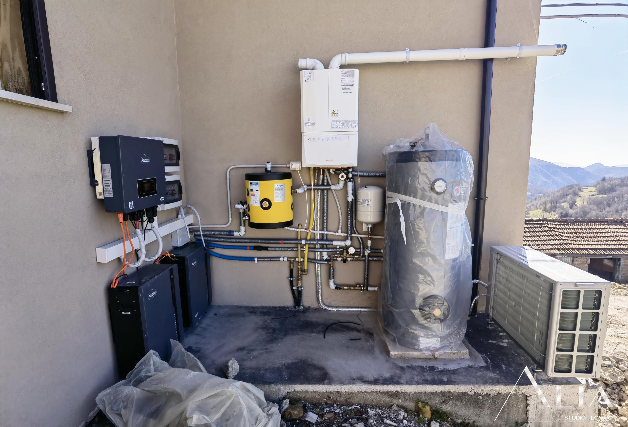 - la sostituzione e ammodernamento dell'intero impianto di riscaldamento e raffrescamento. L'abitazione prevedeva un camino a legna e una vecchia caldaia con termosifoni quali terminali, il tutto sostituito con un nuovo impianto ibrido (pompa di calore + caldaia a condensazione) che riscaldano l'abitazione tramite un pavimento radiante e solo quando il sensore, predisposto in ogni singola stanza, ne dą comando;