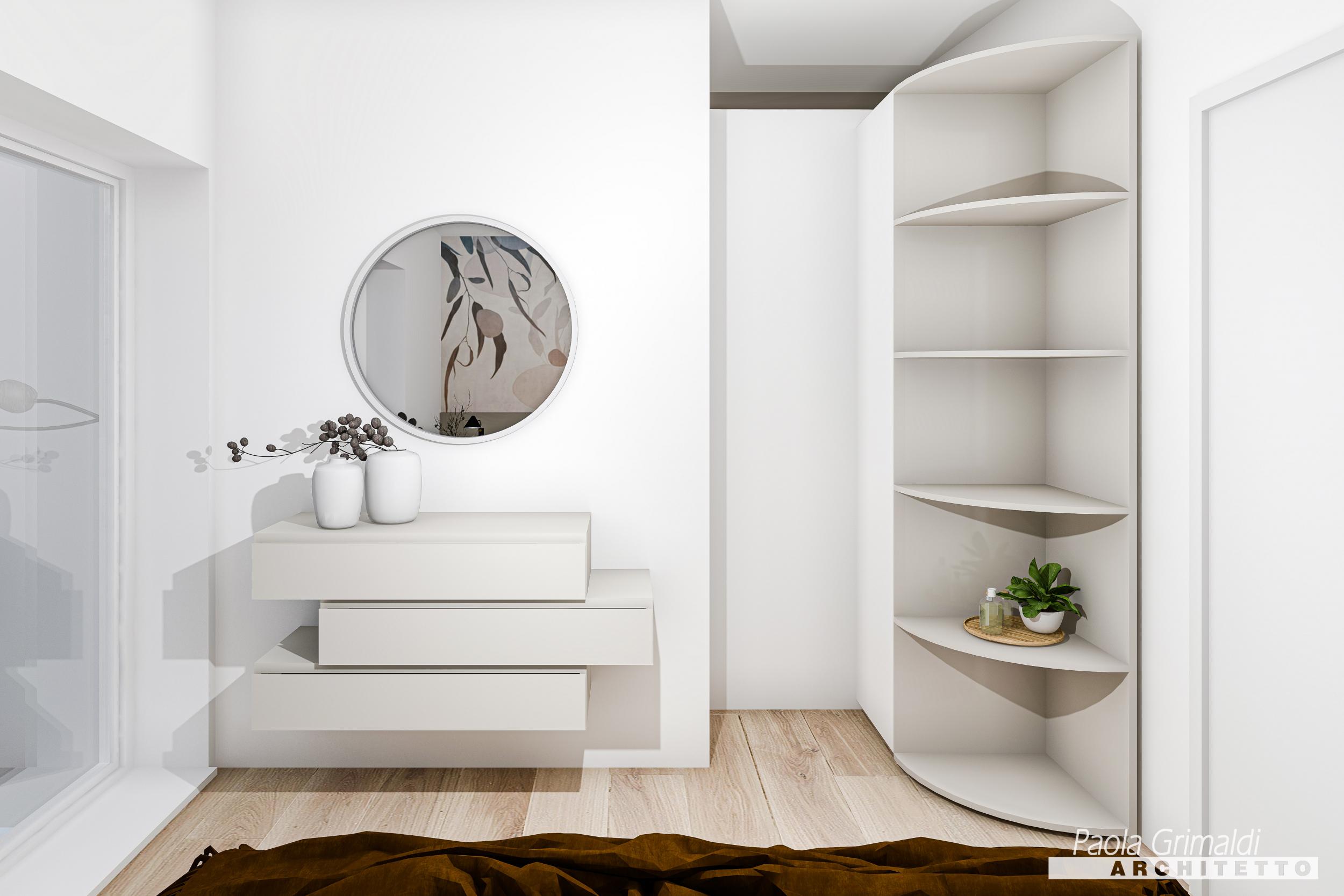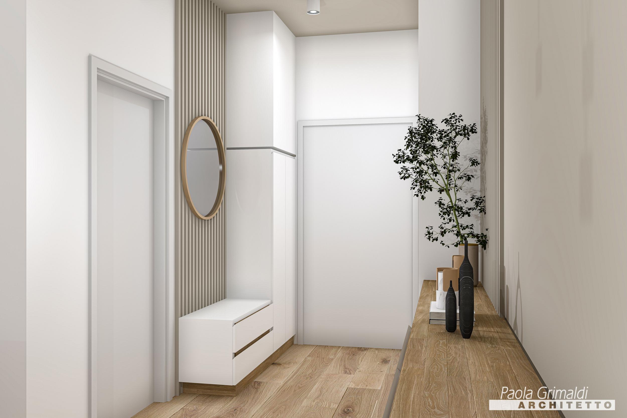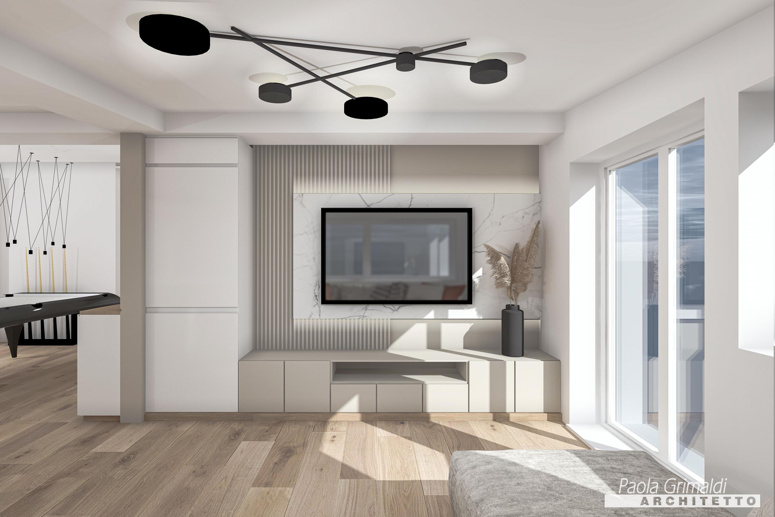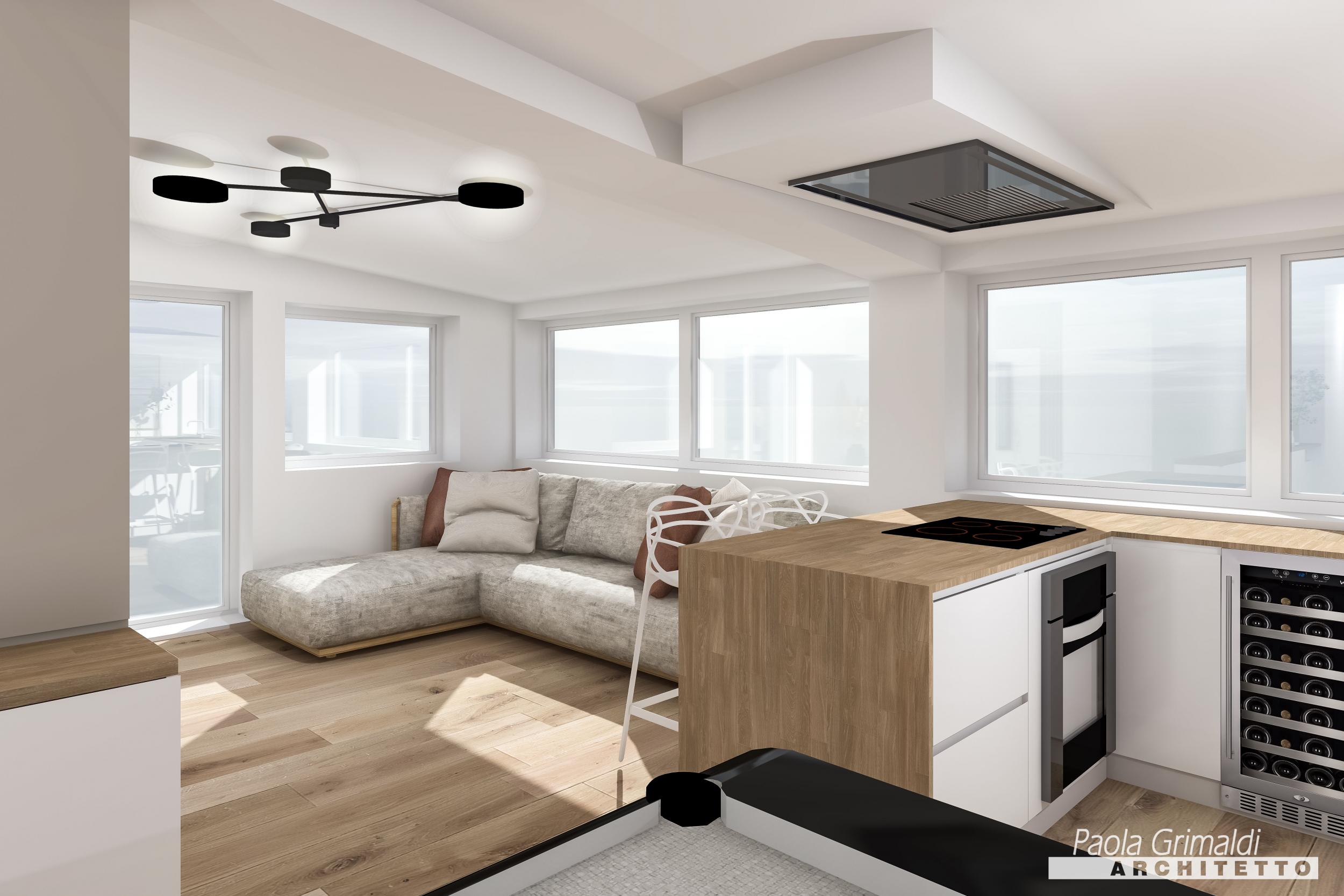 Il progetto ha riguardato il posizionamento di tutti gli arredi, inclusa la predisposizione dei mobili cucina con i suoi elettrodomestici, l'individuazione di una soluzione per inserire un'armadio nella piccola camera da letto, nonchč lo studio su misura del mobile TV difronte il divano e di un mobile d'ingresso appendiabiti da far realizzare ad un artigiano falegname. Le foto mostrano l'ambiente vuoto e i render (simuazioni fotorealistiche) del progetto.