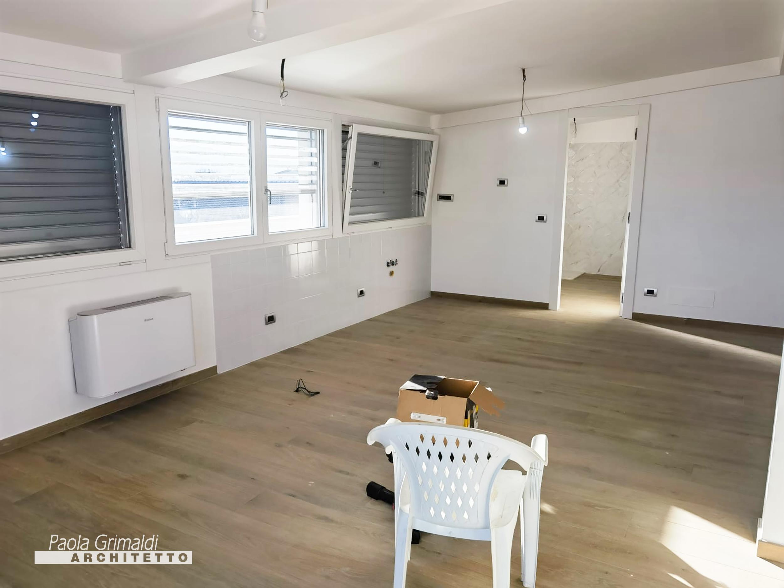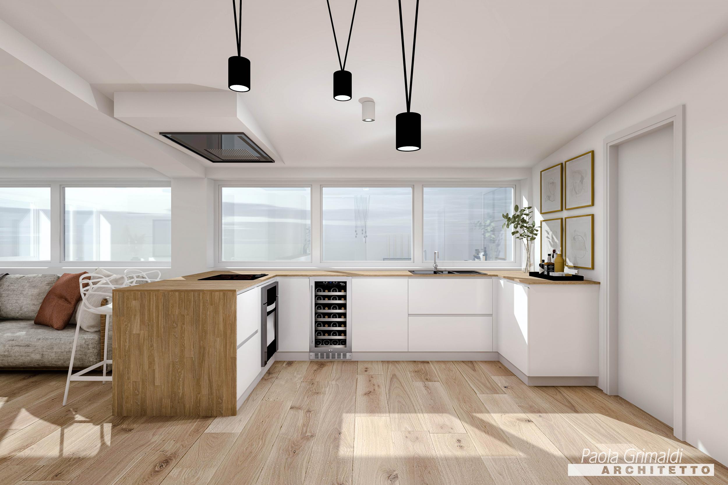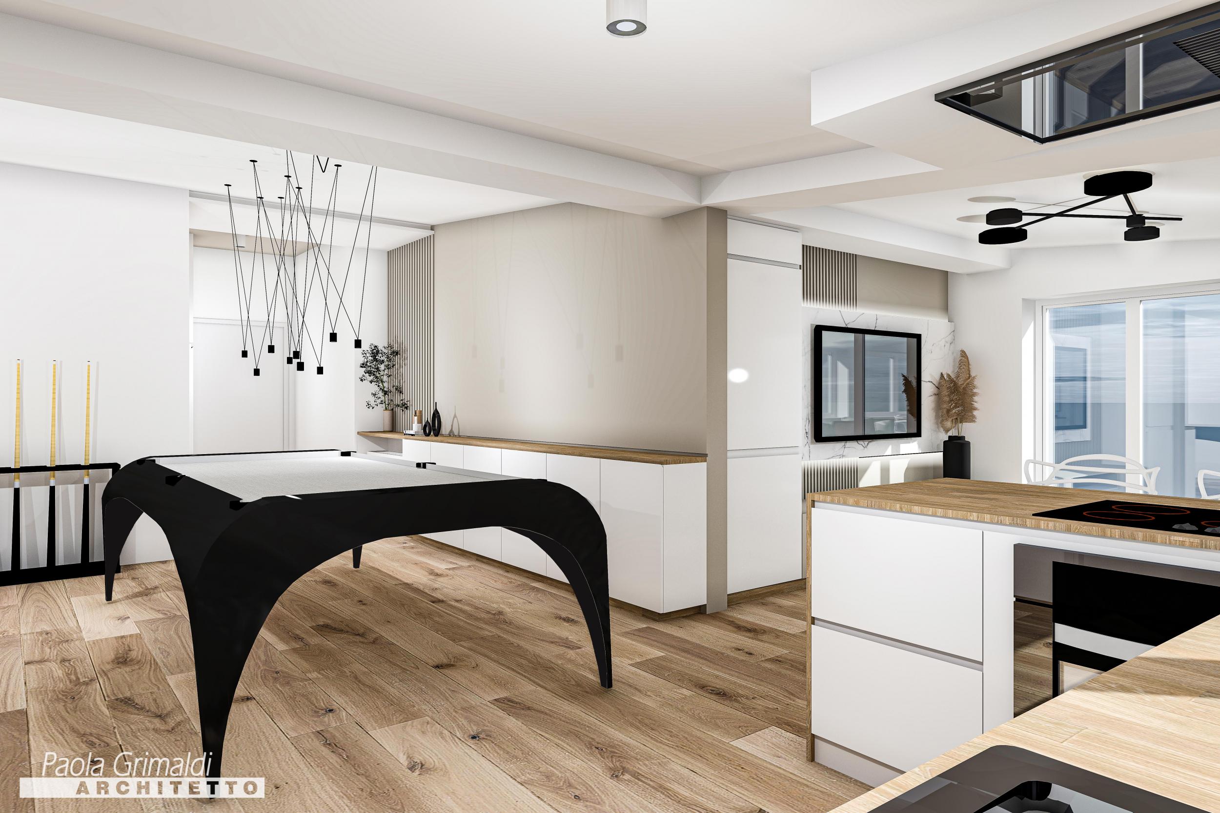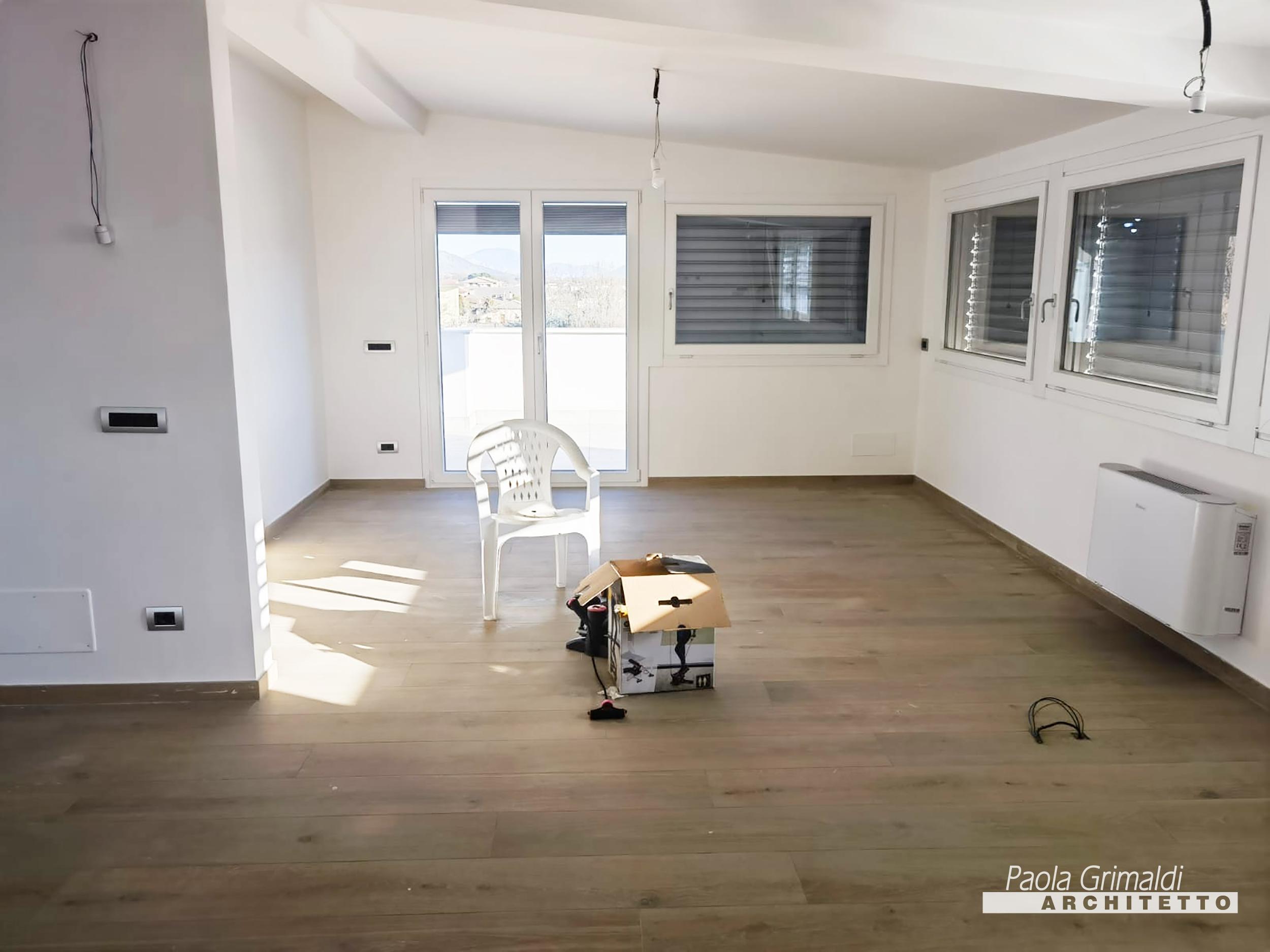 Il progetto ha riguardato il posizionamento di tutti gli arredi, inclusa la predisposizione dei mobili cucina con i suoi elettrodomestici, l'individuazione di una soluzione per inserire un'armadio nella piccola camera da letto, nonchč lo studio su misura del mobile TV difronte il divano e di un mobile d'ingresso appendiabiti da far realizzare ad un artigiano falegname. Le foto mostrano l'ambiente vuoto e i render (simuazioni fotorealistiche) del progetto.